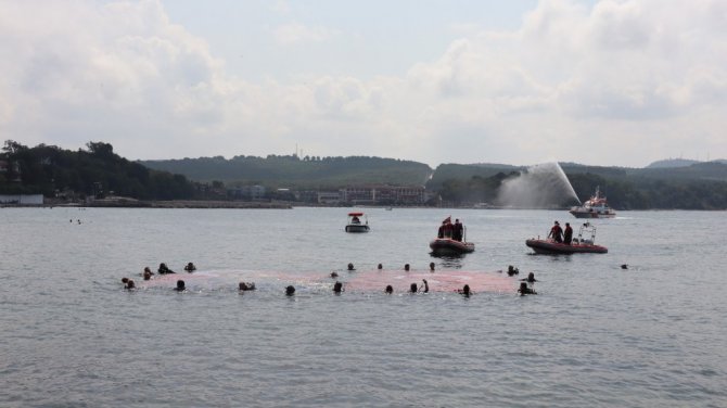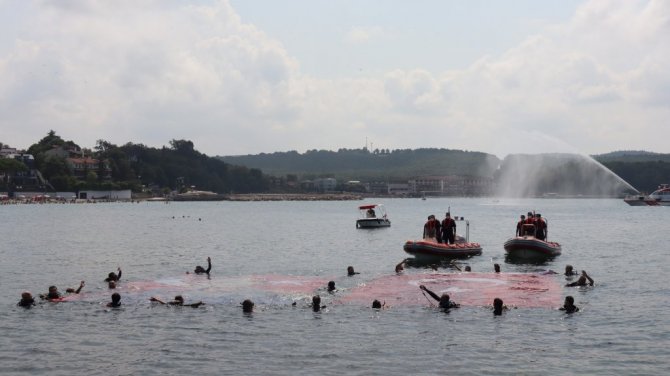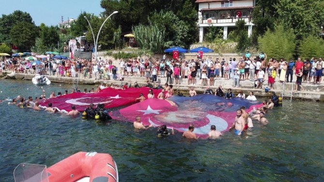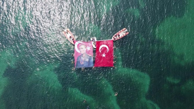Kocaeli'nin Kandıra ilçesinde Deniz Yıldızları Sualtı Sporları Kulübü üyeleri, 30 Ağustos Zafer Bayramı'nın 99'uncu yıl dönümünü kutlamak için Kerpe sahili açıklarında dev Türk bayrağı ve Atatürk resmi açtı.