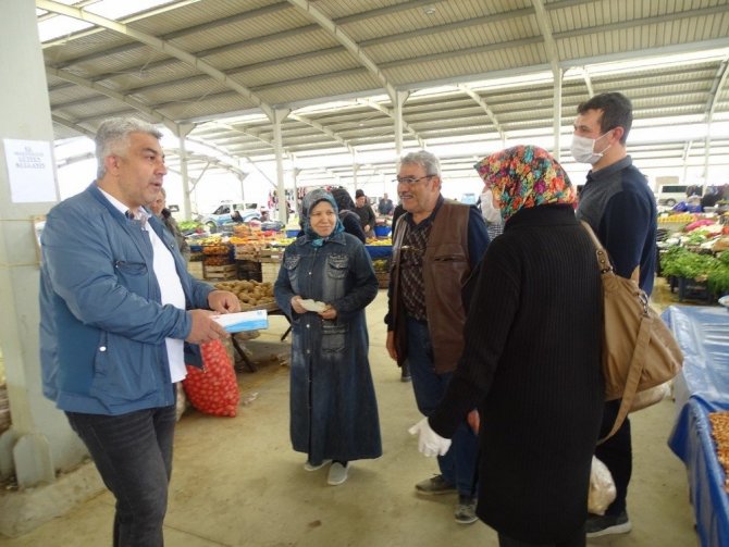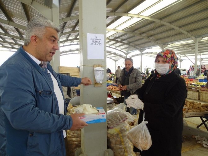 Pazar yerinde incelemelerde bulunan ve eldiven dağıtan Başkan Çalışkan, Korona virüs konusunda esnafı tek tek uyararak sebze ve meyvelerin seçilerek alınmasının yasaklandığını hatırlattı, ayrıca müşteriler arasında sosyal mesafenin korunmasını istedi.
