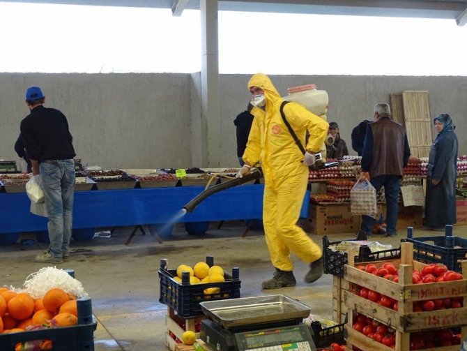Çalışkan, pazar yerinde bazı noktalara dezenfektan kutuları konulduğunu ve Pazar tezgahı aralarının dezenfekte edildiğini söyledi.