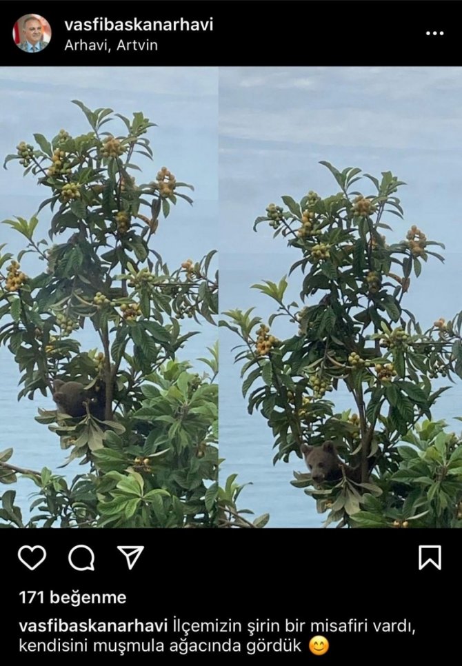 Artvin'in Arhavi ilçesinde aç kalan yavru ayı ilçeye indi. Hacılar Mahallesinde çekilen görüntülerde yavru ayı, yeni dünya ağacına çıkarak ağacın üzerindeki meyveleri yemeye başladı. Arhavi Belediye Başkanı Vasfı Kurtoğlu ise o görüntüleri, sosyal medya hesabından "ilçemizin şirin bir misafiri vardı. Kendisini yenidünya ağacında gördük" diyerek paylaştı.