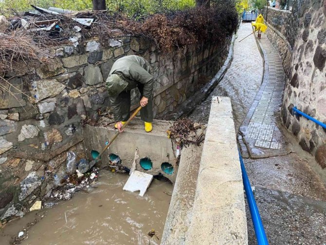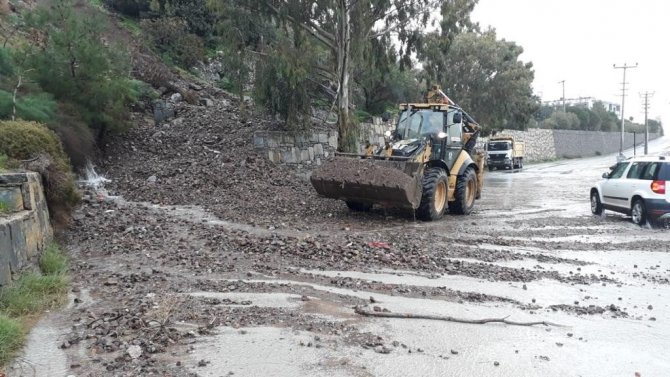 Yalıkavak, Ortakent, Dirmil, Kızılağaç Mahallelerinde yağmur suyu ile birlikte akan ve trafiği tehlikeye düşüren kaya ve toprak yığınları anında temizlenirken mazgalların tıkanmasına neden olan çöp, yaprak ve diğer nesnelere de müdahale edilerek normale döndürüldü.
