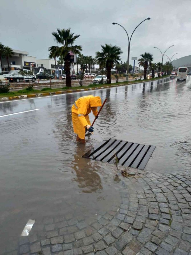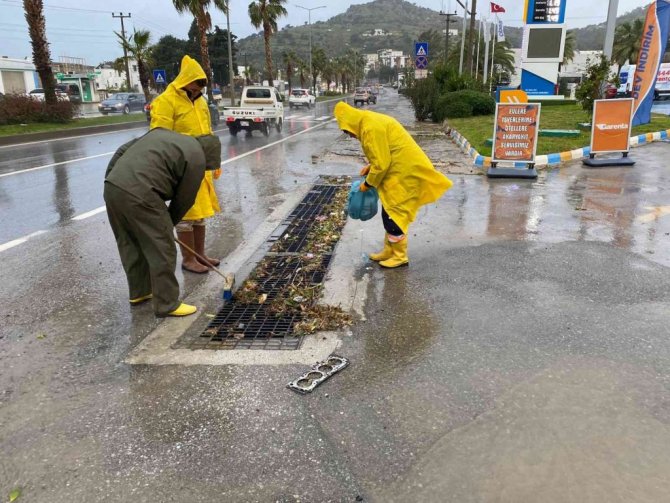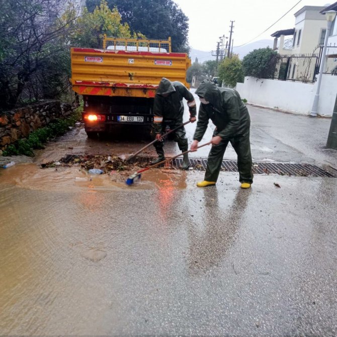 Sabaha karşı şiddetini arttıran yağış sonrası; Bodrum'da Belediye Temizlik İşleri, Fen İşleri, Zabıta, Destek Hizmetleri ile Park ve Bahçeler Müdürlüğü ekipleri sahada görev başındaydı.