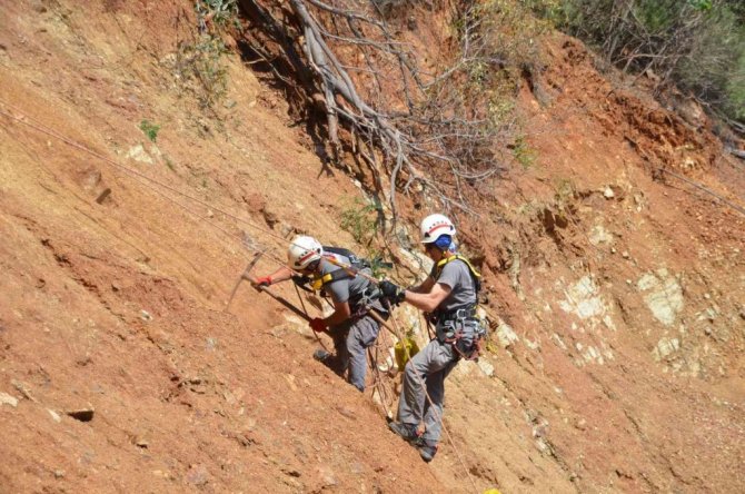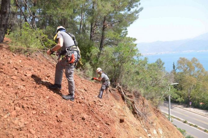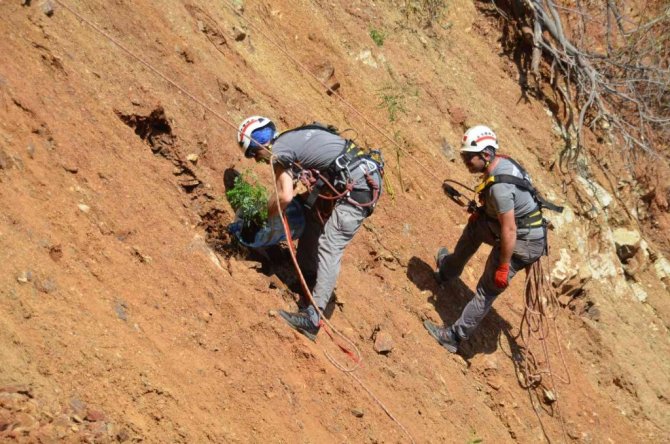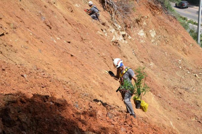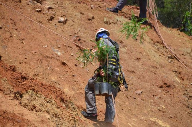 Geçtiğimiz yaz yaşanan yangında 13 bin 650 hektar orman alanı yanan Muğla'nın Marmaris ilçesinde yeniden ağaçlandırma çalışmaları devam ederken belediye ekipleri de bellerine bağladıkları halatlarla, dik yamaçlarda AKUT üyeleriyle birlikte fidan dikti.