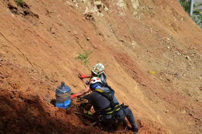 Halatların bir ucunu üst kısımlardaki ağaçlara bağlayan ve aşağı sarkan iki AKUT gönüllüsü fidanların dikileceği alanları kazmalarla kazdı. Ardından fidanları diken gönüllüler kucaklarında taşıdıkları damacanalarla fidanlara can suyunu verdi. Akasya türü ağaçlardan olan Japon soforasının çok hızlı büyüdüğünü, kök yapısıyla toprağa sıkı sıkı tutunduğunu belirten belediye yetkilileri Temmuz - Ağustos'ta açan krem rengi çiçeklerin de arılar için polen deposu olduğunu ifade etti.