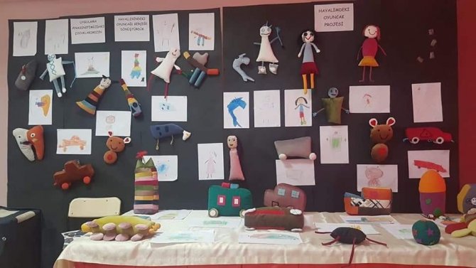Çocuklara kısıtlama getirmeden hayal dünyalarını özgür bırakan öğretmenler, minik öğrencilerin çizdiği resimlerdeki figürlerin birebir oyuncaklarını yaparak çocukların hayallerini gerçeğe dönüştürdü.