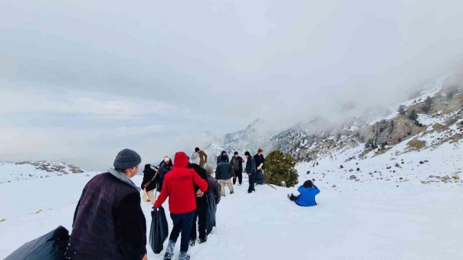 Kahramanmaraş'ta 30 kişilik grup 2 bin 500 rakımlı karlı dağa çıkarak yaban hayvanlarına yem bıraktı.