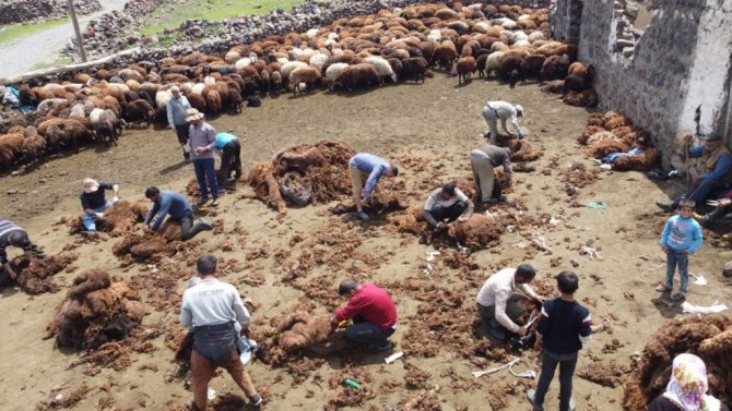 Iğdır'da hayvancılıkla uğraşan çiftçiler yaylada bulunan küçük baş hayvanlarını yünlerini kırkmaya başladı.