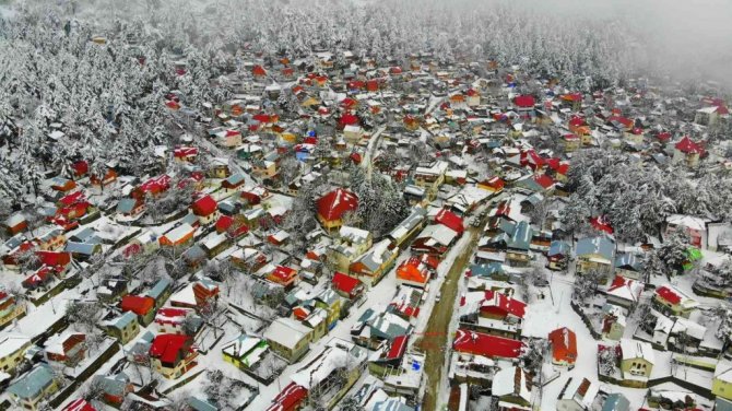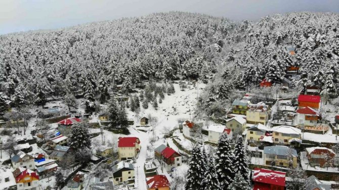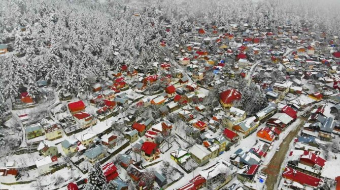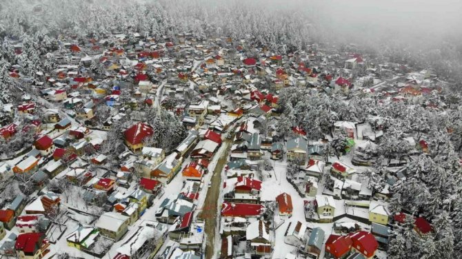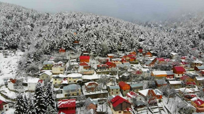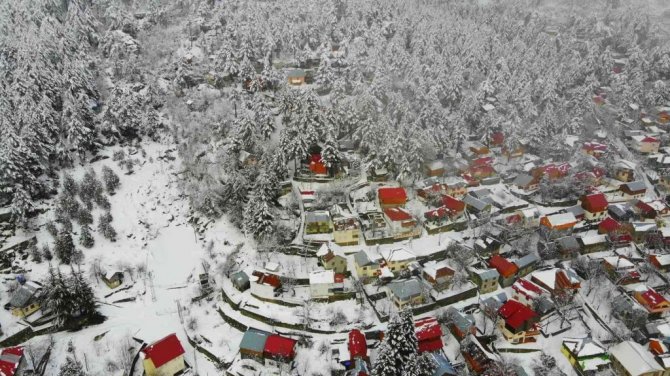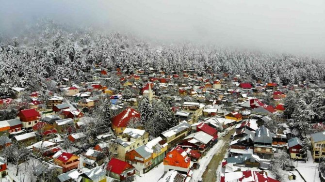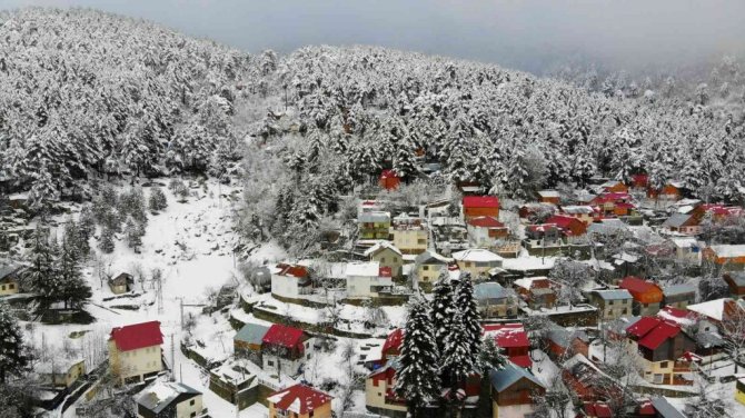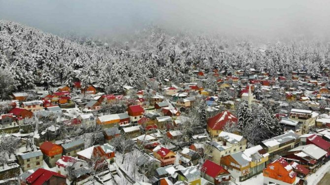 Osmaniye'de Amanos Dağları'nda yer alan Zorkun Yaylası kar yağışıyla birlikte beyaz gelinliğini giyerken, ortaya çıkan kartpostallık görüntüler drone ile havadan görüntülendi.