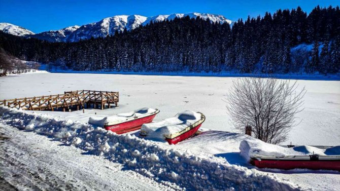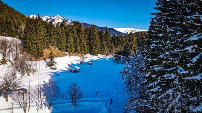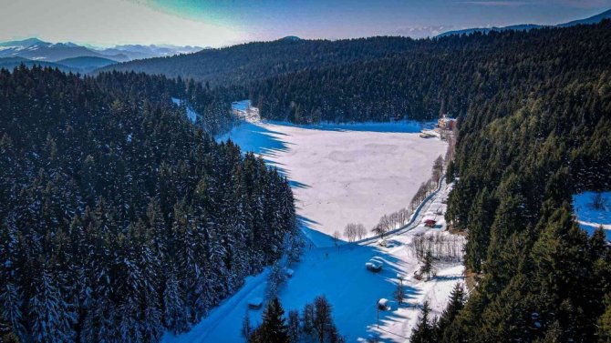 Karagöl'ün buz tutmuş halini görmek isteyenler günü birlik gidip, temiz havası ve muhteşem doğanın tadını çıkartıyor. Güvenlik amaçlı gölün üzerine çıkmak yasaklanırken, buz tutan Karagöl havadan görüntülendi.