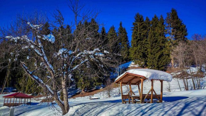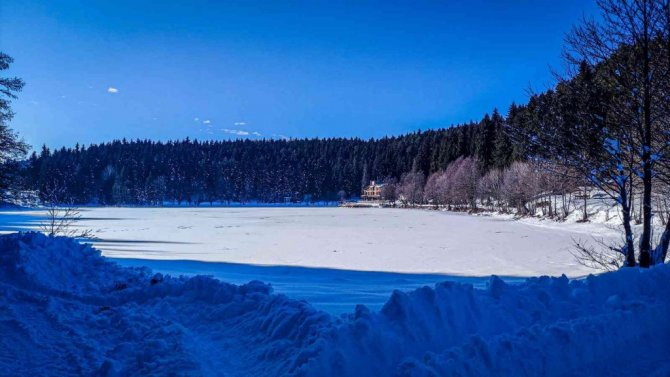 Sahara Milli Park içerisinde yer alan Karagöl, doğal güzelliği ile her mevsim ilgi görüyor. Ladin ve çam ağaçları arasında kalp şeklindeki görüntüsü ile dikkat çeken Karagöl, görenleri adeta büyülüyor. Kentte yoğun kar yağışı ardından Karagöl beyaza bürünürken, gölün yüzeyi ise buz tuttu.