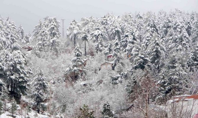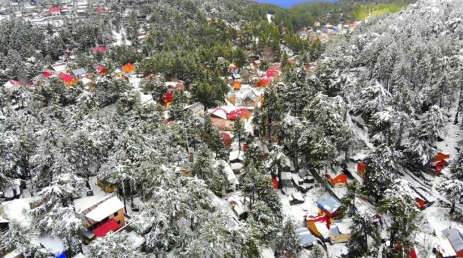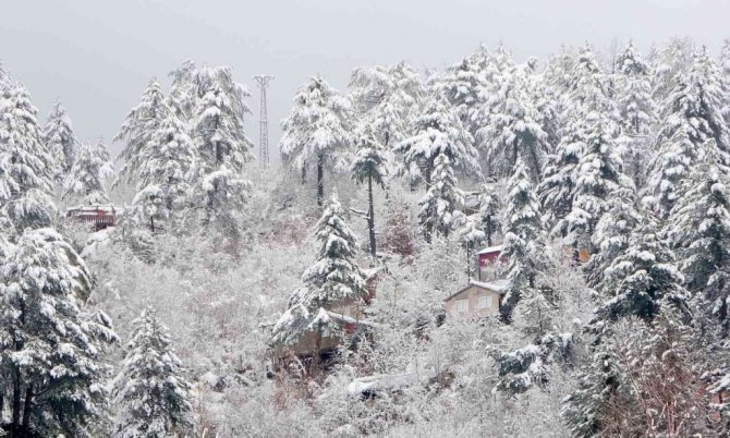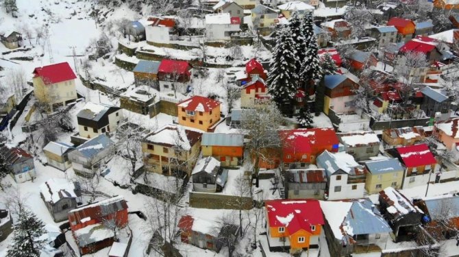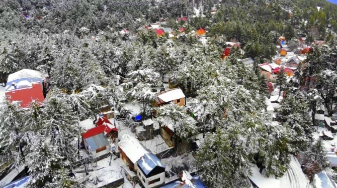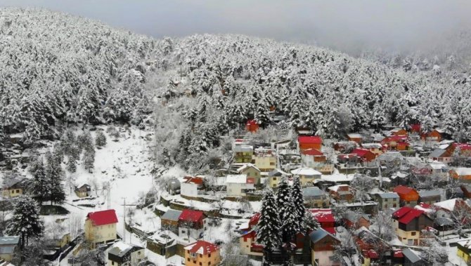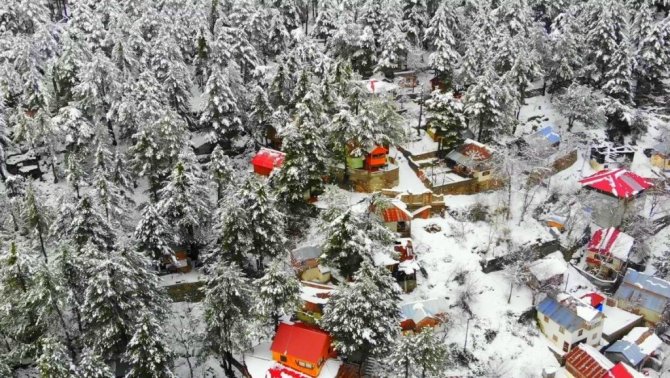 Osmaniye'de Amanos Dağları'nda yer alan Zorkun Yaylası kar yağışıyla birlikte beyaz gelinliğini giyerken, beyaz örtüyle kaplanan yayla evleri drone ile havadan görüntülendi.
