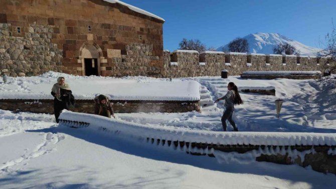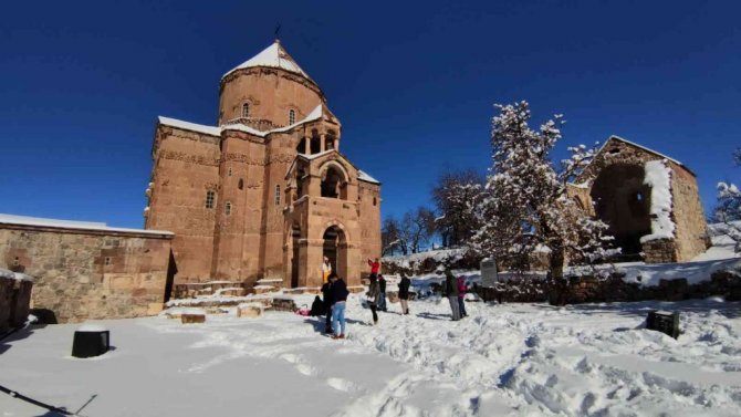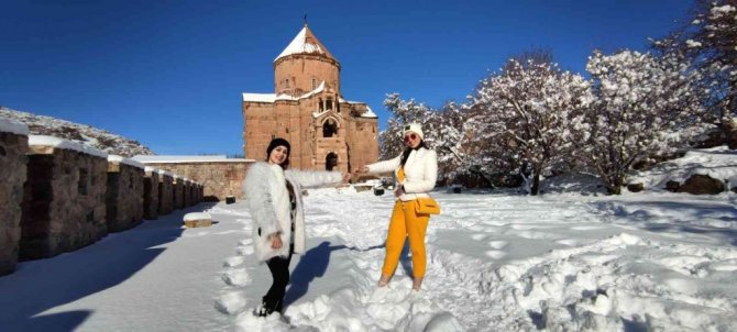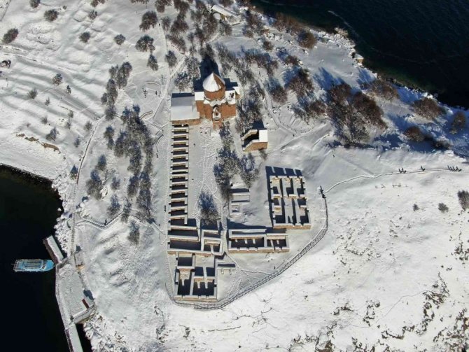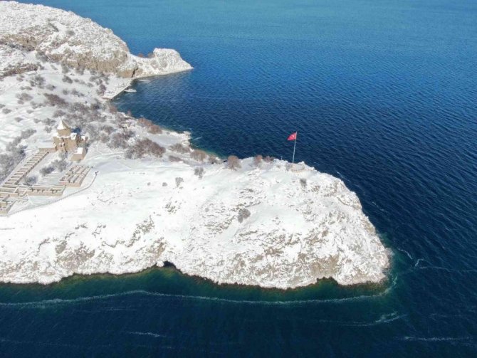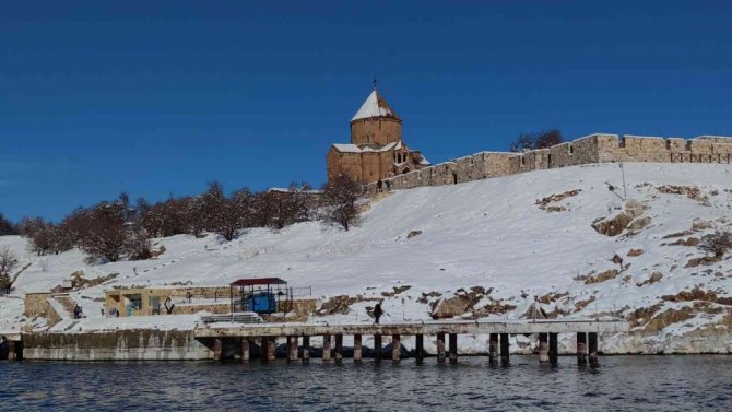 Van'da yağan karla birlikte beyaza bürünen Akdamar Adası, İranlı turistlerin uğrak yeri oldu.
