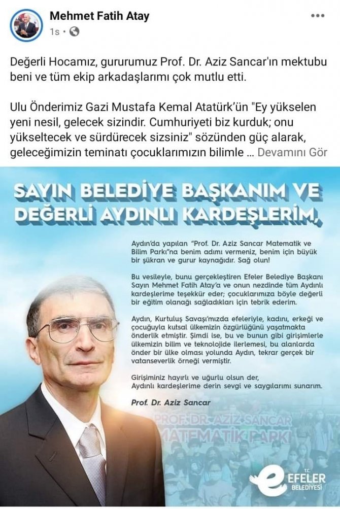 Bilim İnsanı Prof. Dr. Aziz Sancar kendi adının verildiği, Efeler Belediye Başkanı Mehmet Fatih Atay tarafından ilçeye kazandırılan Prof. Dr. Aziz Sancar Matematik ve Bilim Parkı için Efeler Belediye Başkanı Mehmet Fatih Atay'a teşekkür mektubu gönderdi.
