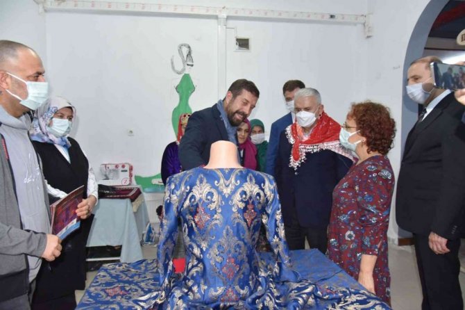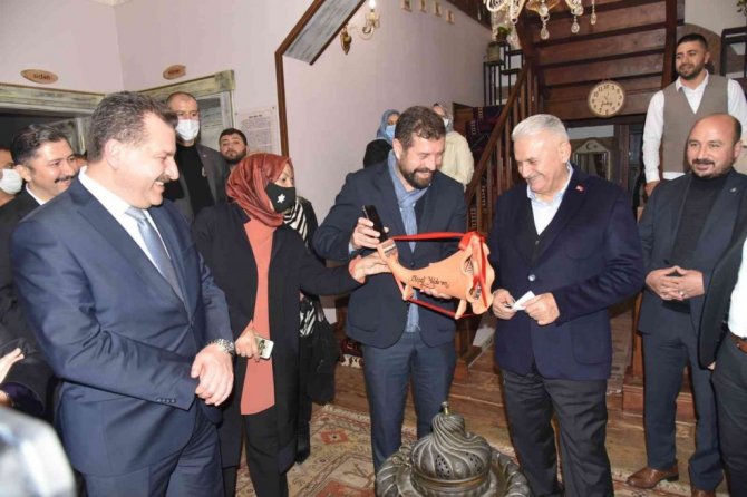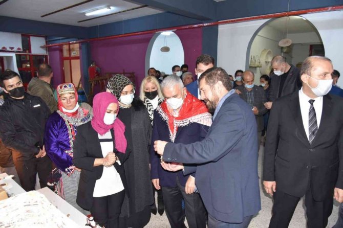 Yıldırım'a günün anısına kadınların ürettiği hediye sepeti ve Sındırgı ile özdeşeleşen toprak gramafon hediye edildi.