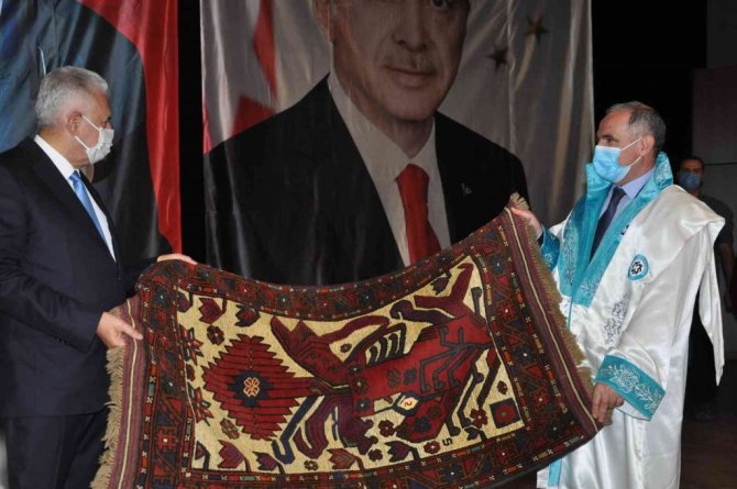 Yapılan konuşmaların ardından KAÜ Rektörü Prof. Dr. Hüsnü Kapu, Yıldırım'a bir plaket ve bir Kafkas halısı takdim etti.