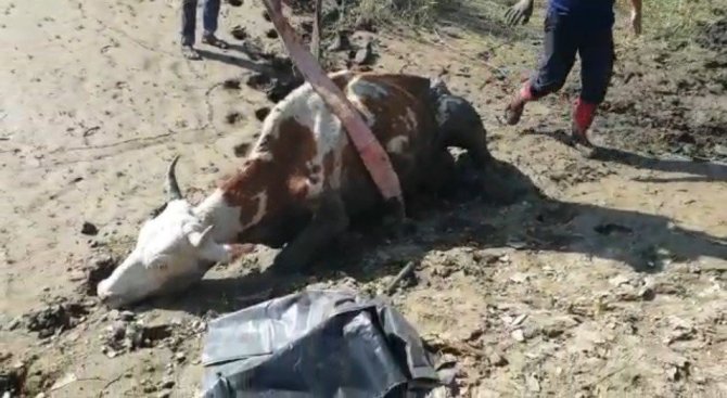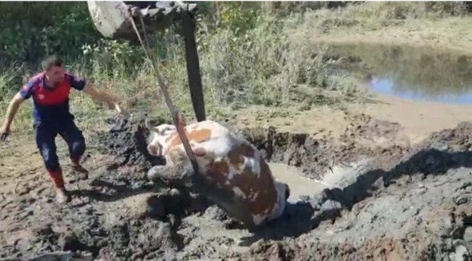 Bingöl'ün Genç ilçesi Murat Nehri kenarında otlanan bir inek çamura saplandı. İnek sahibi uğraşları sonucu hayvanı kurtarmayı başaramayınca durumu Genç Belediyesi itfaiye ekiplerine bildirdi. Bölgeye giden itfaiye ekipleri, iş makinesi yardımıyla ineği mahsur kaldığı çamurdan kısa sürede kurtararak sahibine teslim etti.