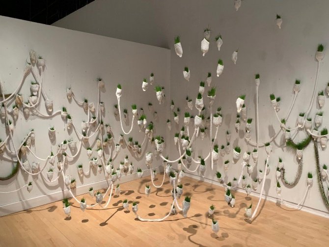 Kadın cinayetlerine dikkat çekmek için Kuşadası’nda“ ruhları iyileştirmek “ isimli sergi açıldı. Bio-Art sanatçısı Dilay Koçoğulları tarafından açılan sergide, Kuşadalı 75 kadın ve erkek tarafından keseler örülerek oluşturulan anıt yer alıyor.