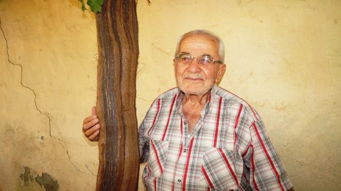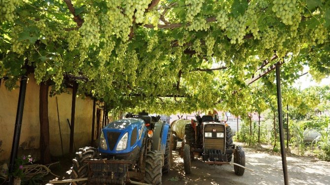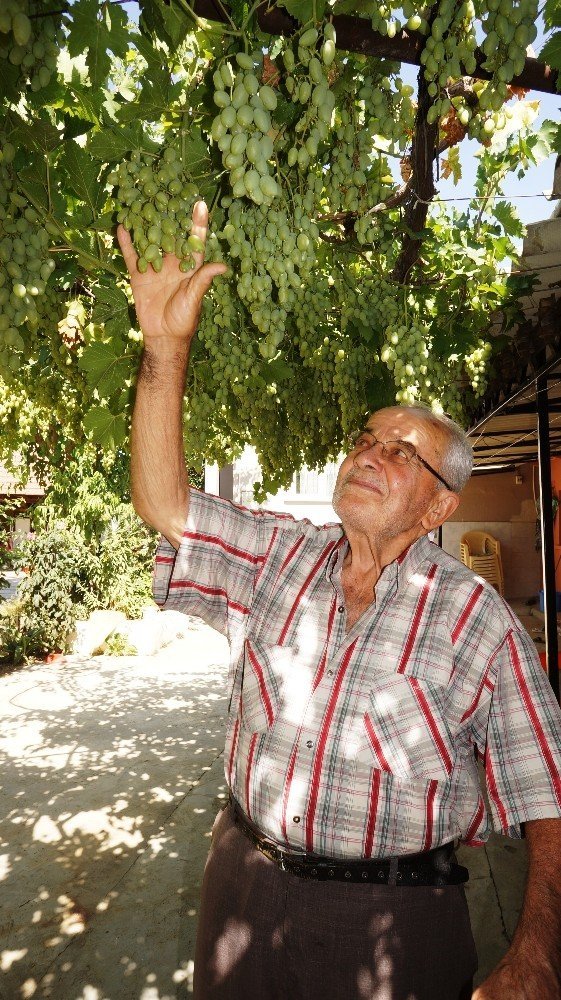 Manisa’nın Sarıgöl ilçesi Çanakçı Mahallesinde yaşayan 78 yaşındaki İbrahim Akçam, evinin bahçesine 15 yıl önce diktiği 35 metre uzunluğundaki Mevlana türü üzüm asmasından her yıl bir tondan fazla üzü...