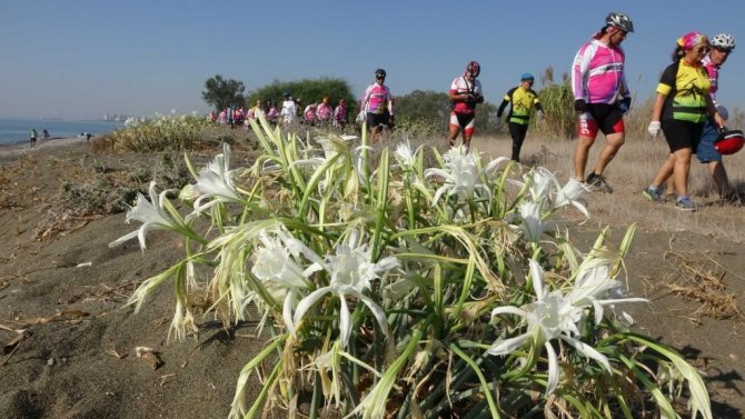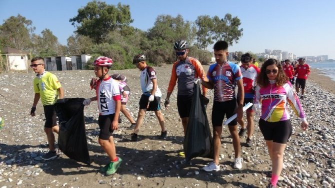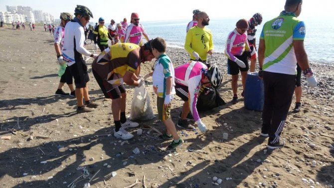 Mersin'de düzenlenen ve 22 ilden katılımın sağlandığı festivale gelen bisiklet tutkunları, 35 kilometre pedal çevirerek ulaştıkları Erdemli Alata sahilinde Caretta Caretta ile Celonia Meidas'ların (Yeşil Deniz Kaplumbağası) yuvalama alanlarını temizledi.