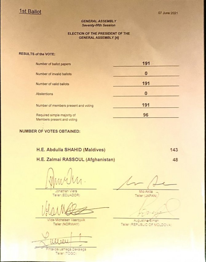 Birleşmiş Milletler (BM) Genel Kurulunun yeni dönem başkanlığı için gerçekleştirilen seçimde Maldivler Dışişleri Bakanı Abdulla Shahid ile Afganistanlı tecrübeli diplomat Dr. Zalmai Rassoul yarıştı. Seçimlerin sonunda 143 oy ile Shadid, 76'ıncı BM Genel Kurulu Başkanı olarak seçilirken, Rassoul ise 48 oy aldı.