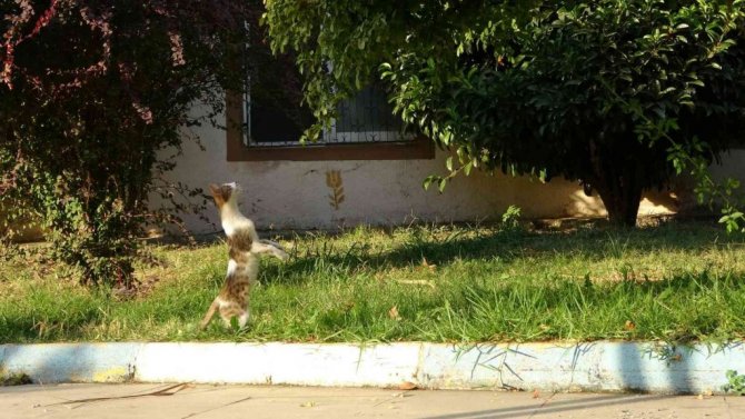 Osmaniye'nin Düziçi ilçesinde bir kedinin mirket gibi ayağa kalktıktan sonra zıplayarak ağaç dallarındaki böcekleri yakalamaya çalışması ilginç görüntüler oluşturdu. Yaklaşık 2 metre zıplayarak böcekleri yakalamaya çalışan kedi hareketleriyle vatandaşları tebessüm ettirdi.