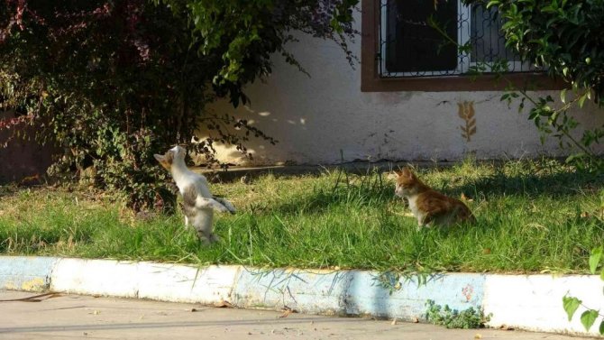 Düziçi'nde bulunan Atatürk ve Demokrasi Meydanı'ndaki çay ocağının etrafında dolaşan kedinin ilginç davranışları tebessüm ettirdi. Bodur ağaçlardaki böcekleri yakalamaya çalışan kedi önce mirket gibi ayaklarının üzerinde durdu ardından zıplayarak ağaç dallarında bulunan böcekleri yakalamaya çalıştı. Kedinin böcek yakalama çabası vatandaşlarda tebessüm oluştururken, zaman zaman yanındaki kediyle oyun oynaması da ilginç görüntüler oluşturdu.