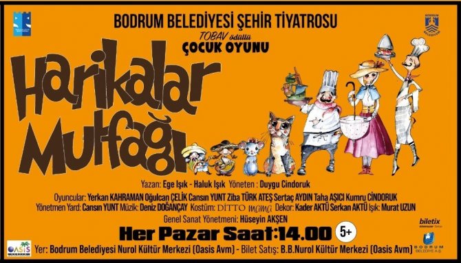 Bodrum Belediyesi Şehir Tiyatrosu’nun müzikal tadındaki “Harikalar Mutfağı” çocuk oyunu, Nurol Kültür Merkezi’nde (Oasis AVM) her Pazar çocuklarla buluşuyor. 05 Ocak 2020 Saat: 14.00’de oynanacak yılın ilk oyununda, hikayenin kahramanları olan aşçılar Gümüşkepçe ve Kırıkçatal’ı bir takım sorunların arasında izliyoruz. Sahibi olduğu Çocuk Evleri için en güzel yemekleri yapacak aşçıyı arayan Bayan Gülücük’ün gelişiyle işler karışıyor. Bilmiş fare Kazmadiş ile saf kedi Yorgunpençe’nin maceraları da tam bir çizgi film havasında sergileniyor.