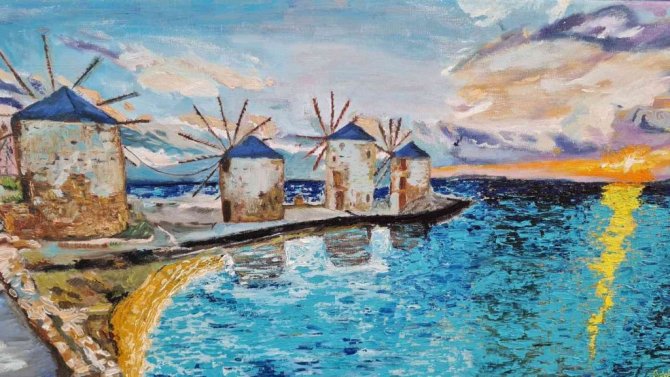 Sergide Bodrum ve Yunan adalarını resmettiğini söyleyen Sibel Koca; "Güneşin iki yerde de bir anda doğup bir anda batışı ilgimi çekmişti. Buradan esinlenerek aklıma geldiği gibi renklerle tuvalime döktüm. Fırçam, özgürce tamamen bana aittir. Şu an sergide 23 resmim var. Bunları kısa bir sürede yaptım. Sergide Bodrum ve Yunan adaları, yelkenliler, eski Yunan evleri, günbatımlarını resmettim. Yunanistan ve Türkiye arasındaki dostluğa karınca kararınca benim de katkım olması için sergime böyle bir isim koydum. Ben yağlıboya çalışıyorum sıcak renkleri tercih ediyorum. Kendi ruhumu katmak istiyorum. Ben hayat dolu bir insanım, onu tuvallerime yansıtmaya çalışıyorum" dedi.