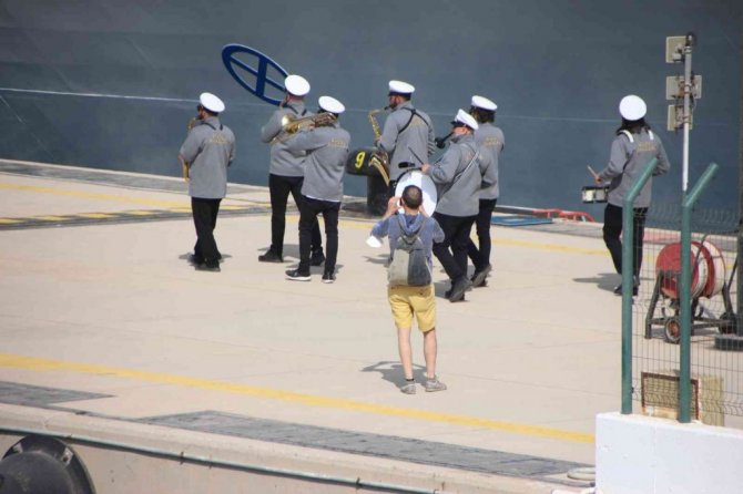 Muğla'nın Bodrum ilçesine tarihinin en büyük yolcu gemisi gelirken, gemi bandoyla karşılandı.