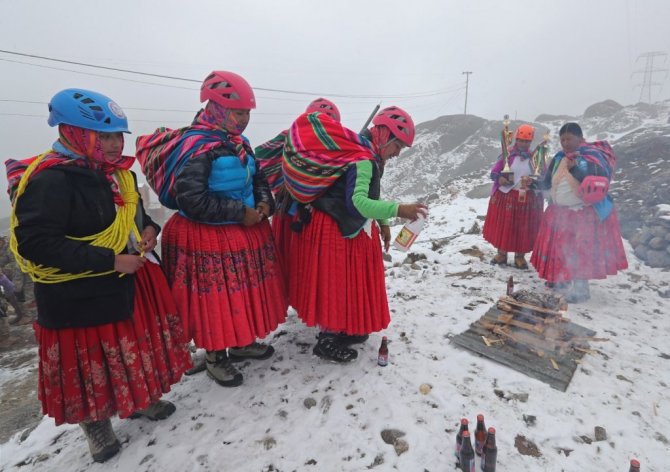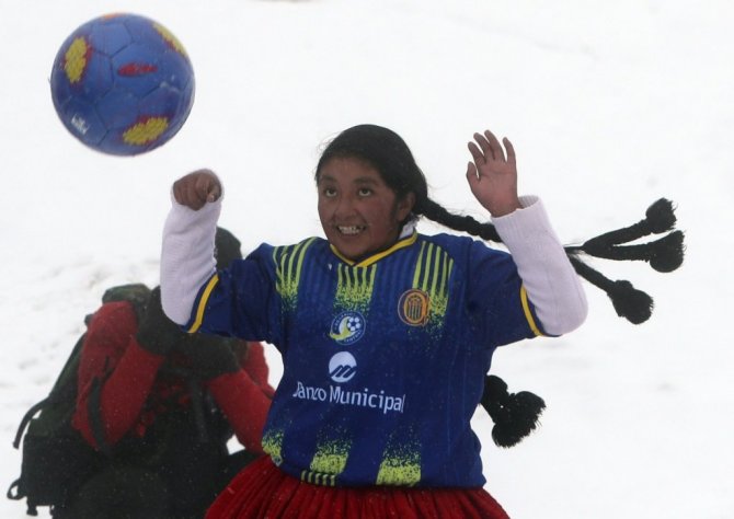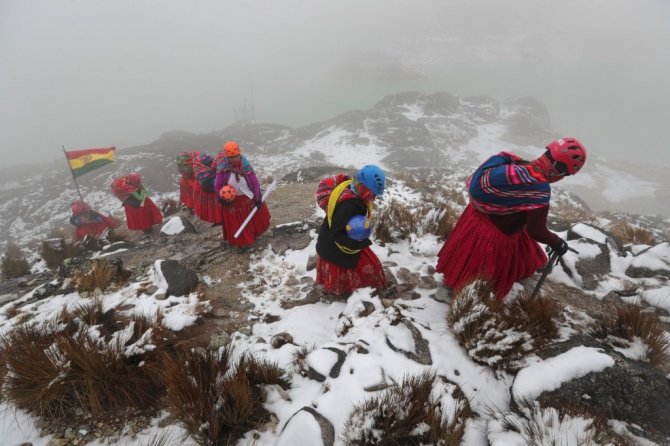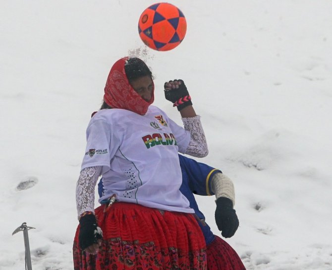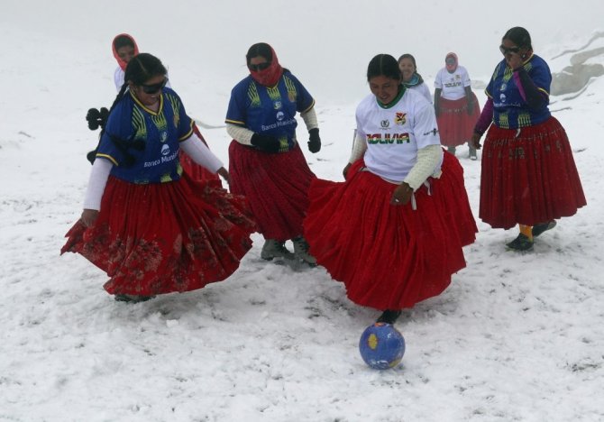 Bolivya'daki yerli Aymara toplumundan kendini dağcılığa adayan 14 kadın, geleneksel kıyafetleri ile başkent La Paz yakınlarındaki Huayna Potosi Dağı'na tırmanarak 5 bin 980 metre yükseklikte yoğun kar yağışı altında futbol maçı yaptı. Kendilerine "The Cholitas Climbers" adını veren kadınlar, Bolivya milli takımının formalarını giyip 2 gruba ayrılarak 50 dakikadan fazla bir süre top koşturdu.