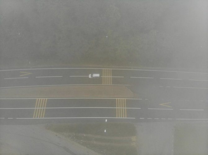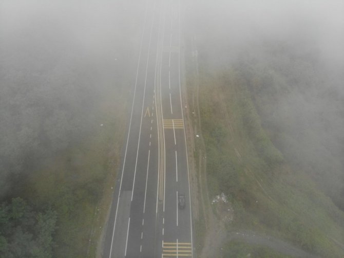 100 Karayolu Bolu Dağı mevkiinde sağanak yağış ve yoğun sis etkili oluyor. Sisle kaplı yol havadan görüntülendi.
