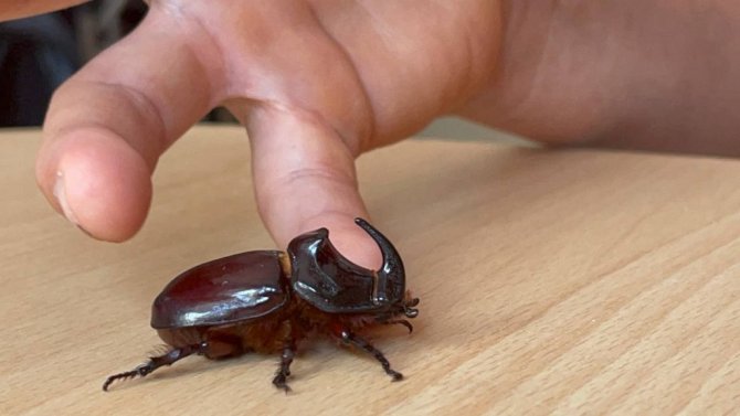 Boynuzlu gergedan böceğine gözü gibi bakıyor