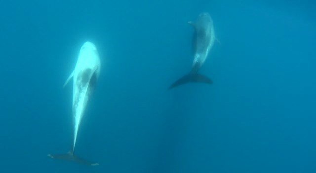 Çanakkale'nin Gökçeada ilçesi açıklarında görülen literatürde "Grampus" olarak bilinen boz yunus balıkları, milli sporcu Selim Konya tarafından görüntülendi.