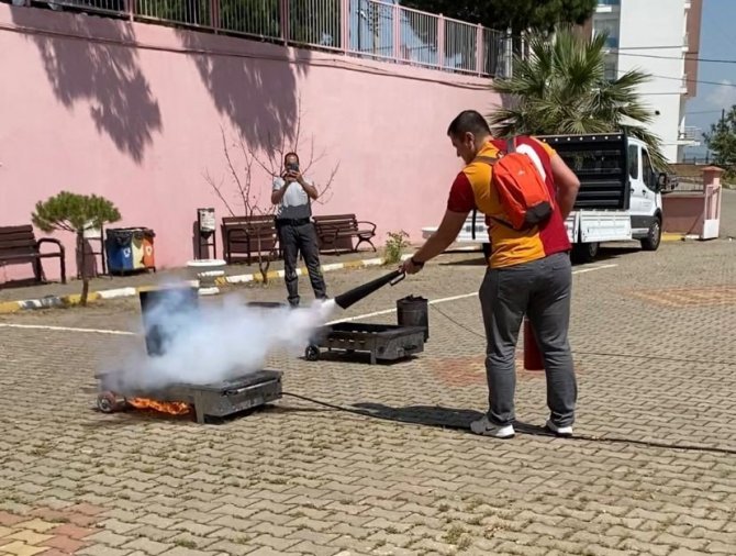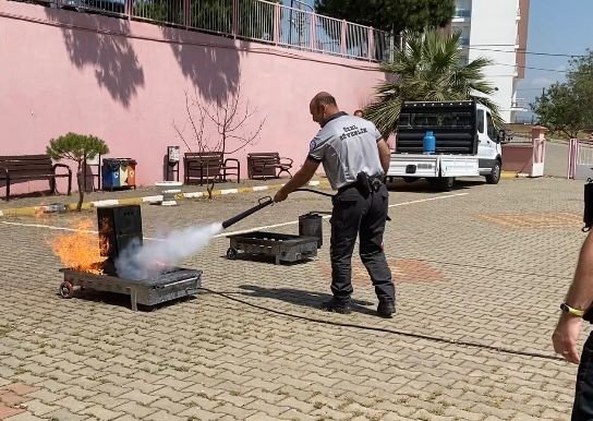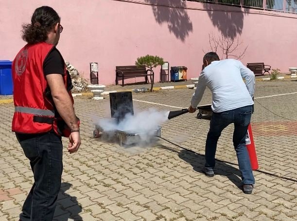 Tatbikatın ardından Meslek Yüksekokulu bahçesinde yakılan kontrollü ateşe ilk müdahalenin nasıl yapılacağı karbondioksit gazlı söndürme tekniği ile gösterildi. Ardından Meslek Yüksekokulu yangın ekibi ile öğrencilerin yangın söndürme tüplerini kullanması sağlandı. Tatbikat sonrasında Meslek Yüksekokulu Müdürü Dr. Öğr. Üyesi Bilginer Tuna, tatbikat eğitimini veren ADÜ İSGB Koordinatörü Öğr. Gör. Dr. Nadir Savaş Öter ile tatbikata katılan herkese teşekkür etti.