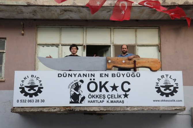 İş yerinde devasa büyüklükte bıçak yaptıklarını ve yapılan bıçakla Guinness Rekorlar Kitabı'na da girmeyi hedeflediklerini söyleyen Bahaettin Çelik, "Bıçağın uzunluğu 3 metre 300 santimetre, 97 kilogram. Bir buçuk aylık gibi bir zamanımızı aldı. Marangozu sapı ve işlemesi gibi çeşitli ustalarımızın da desteği ile hazırladık. Guinness Rekorlar Kitabı'na başvuruda bulunmayı düşündük ancak bundan büyük bir bıçak yapım aşaması oluşur diye başvurmadık. Ancak şuanda onun için çalışmalar da yapıyoruz. 2023'e kadar Expo'ya kadar bu çalışmayı yapacağız ve hedefimiz Guinness Rekorlar Kitabı'na girmektir. Hartlaplı ustalar bıçak yapımında kendilerine has tekniklerini geleneksel olarak usta çırak ilişkisi içinde babadan oğula aktararak sürdürüyor. Sap kısmında kullanılan manda boynuzu, koçboynuzu, keçiboynuzu, şimşir ağacı geleneksel olarak kullanılırken, elde edilen ürünler Türkiye'nin birçok noktasına gönderiliyor.