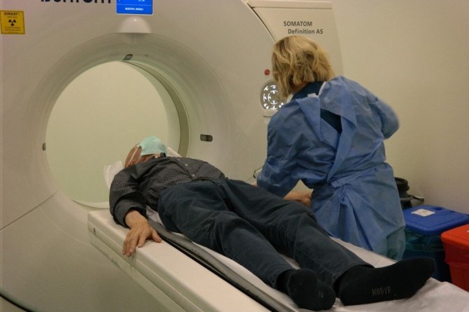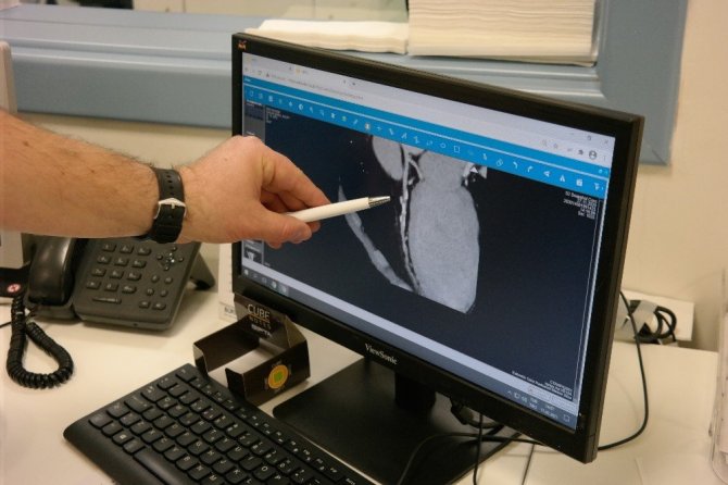 Tomografi ünitesinde damar tıkanıklıklarının değerlendirilmesinde alternatif olarak BT anjiyo işleminin de kullanıldığından söz eden Uzman Doktor Ali Murat Aynacı, damar darlığı şüphesi olan hastalara kardiyoloji bölümünün isteği doğrultusunda radyoloji bölümünde BT anjiyo uygulandığını söyleyerek, "Koroner BT anjiyo ciddi bir şikâyeti olmayan ancak obezite, hipertansiyon, kolesterol yüksekliği, şeker hastalığı ve ailesel kalp hastalık öyküsü olan risk grubundaki hastalara da uygulanabiliyor. Hastalarda damar kireçlenmesi şüphesi varsa kalsiyum skorlama adını verdiğimiz görüntüleme yapılıyor. Doğumsal kalp damar anomalilerinde çok faydası oluyor çünkü normal anjiyoda görüntülemek çok zor olabiliyor. Koroner BT anjiyoda ciddi damar patolojisi saptan hastalar kateter anjiyoya yönlendiriliyor ve balon-stent tedavileri veya ameliyat planlaması yapılıyor." dedi.