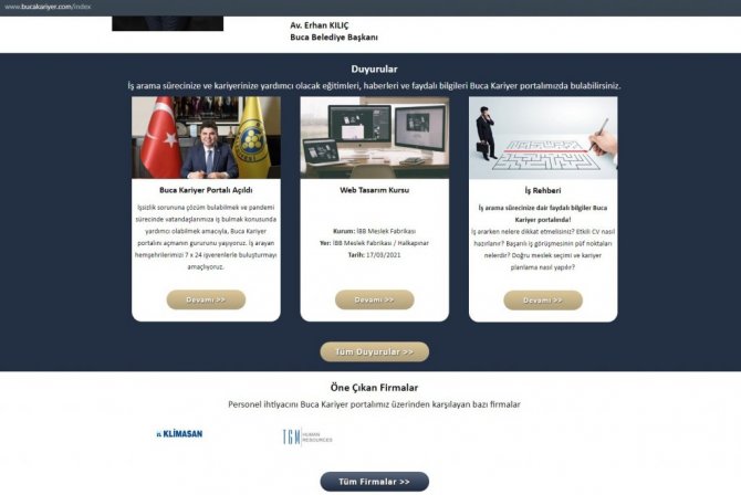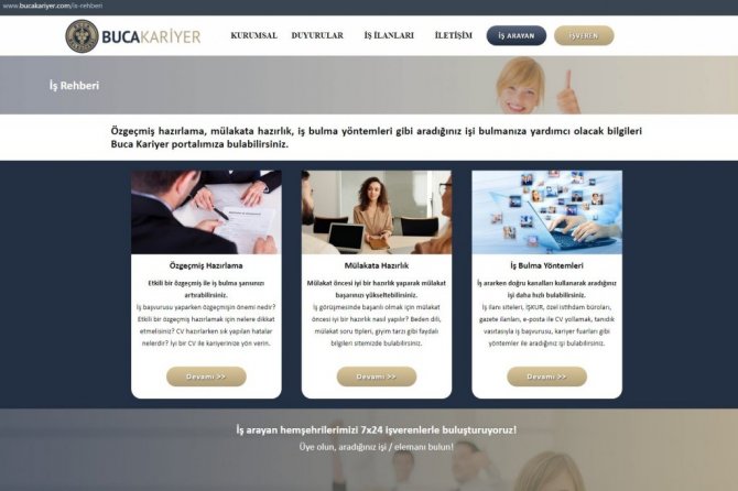 İşsizliğe karşı proje geliştiren Buca Belediyesi, vatandaşların iş sahibi olmasının önünü açan Buca Kariyer Platformu'nu hayata geçirdi. Bir yandan hemşehrilerin meslek sahibi olmaları için eğitimlerini sürdüren belediye, Buca Kariyer Platformu'yla işveren ve işçi arasında köprü kurdu. Çalışmalarını "bucakariyer.com" internet adresi üzerinden gerçekleştirecek platform, Buca'da ikamet eden ve iş arayışında olan vatandaşların firmalar tarafından açılan iş pozisyonlarına kolaylıkla başvuru yapabilmelerine olanak sağlayacak. İş arayışında olan vatandaşların iş bulma süreçlerini hızlandıracak platform, iş bulma sürecine dönük kariyer etkinlikleri, özgeçmiş hazırlama yöntemleri, mülakat süreçleri gibi konularda yapacağı eğitimlerle vatandaşların kariyerlerine yön verecek.