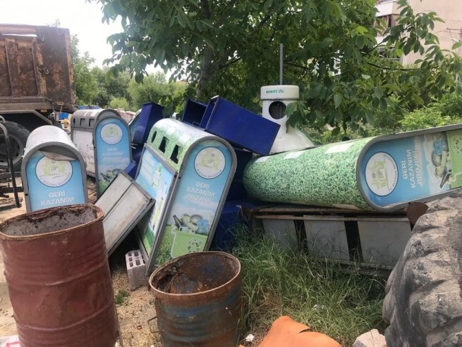 Denizli'de bir ilçenin farklı noktalarına kurulan ve geri dönüşüm malzemelerinin ekonomiye kazandırılması amaçlanan konteynırlar sökülerek çöpe atıldı.