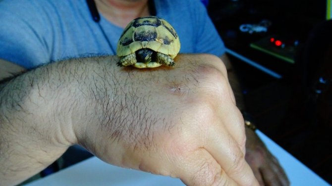 Karaman'ın Ermenek ilçesinde bir vatandaş yürüyüş yaparken bulduğu ceviz büyüklüğündeki kaplumbağa yavrusunu milli parklar görevlilerine teslim etti.