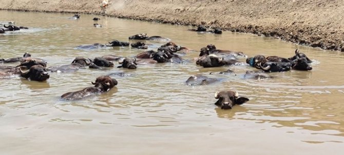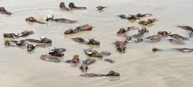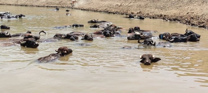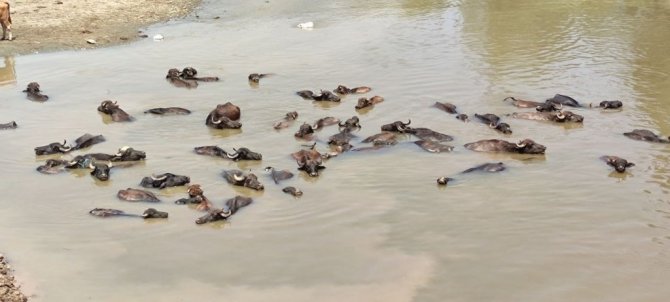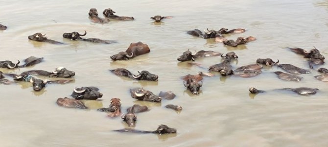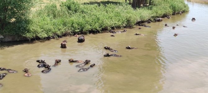 Muş'ta hava sıcaklığının bunaltıcı seviyelere çıkmasıyla mandalar Karasu Nehri'ne girerek serinliyor.
