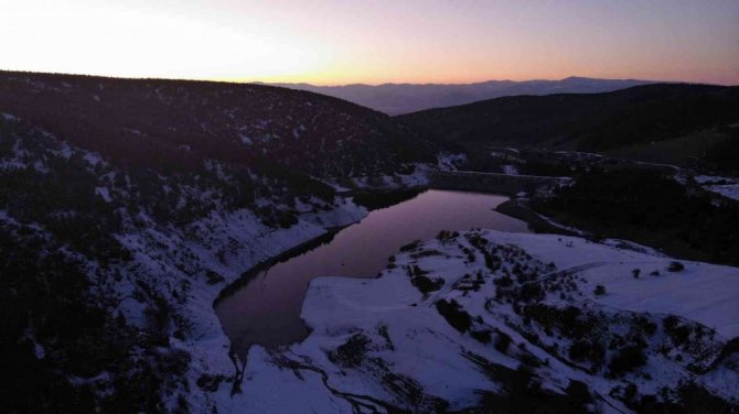 Burdur'da hafta sonu etkisini arttıran kar yağışının ardından yüksek kesimler beyaza büründü. Kar yağışı gün batımıyla eşsiz manzaraları da beraberinde getirdi.