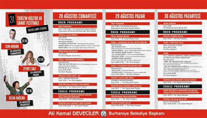 28-29 ve 30 Ağustos tarihlerinde yapılacak Festivalde Selda Bağcan, Cem Adrian ve Ziynet Sali ayrı ayrı konserler düzenleyecek. Burhaniye Belediyesine ait Taylıeli Amfi Tiyatro'da düzenlenecek dev konserler haricinde Belediye tarafından İskele ve Ören Meydanları'nda da etkinlikler, konser ve tiyatro oyunları düzenlenecek.