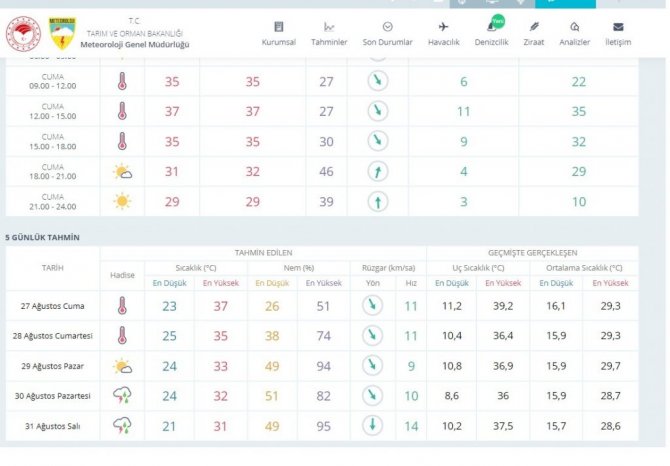 Sabah saatlerinde hava sıcaklığı 35 derece olması beklenirken; sıcaklık öğle saatlerinde 37 dereceye kadar yükselecek. Cumartesi günü 35 dereceye düşmesi beklenen sıcaklıkların, Pazartesi gününden itibaren 3 derece daha azalarak yerini gök gürültülü sağanak yağışa bırakacağı tahmin ediliyor.