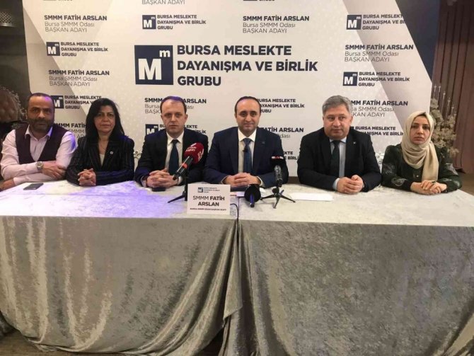 Bursa SMMMO Başkan adayı Fatih Arslan, "Bursa Meslekte Dayanışma ve Birlik Grubu, 1990 yılından günümüze 32 yıllık geçmişe sahip büyük ve kurumsal bir yapıdır. Osman Çetinkaya, Hayrettin Çakmak, Niyazi Pakyürek, Harun Akın, Osman Arıcı, Fikri Pala, Recai Ekmekçi, Cemil Tekin, Burhan Özen, Ebubekir Şimşek, Ali Nazım Tekelioğlu, Ali Çevdir, Asım Karaman ve daha ismini sayamadığım pek çok değerli ve Bursa kamuoyunun da yakından tanıdığı isimlerin içinde yer aldığı büyük ve köklü bir ailedir. Bu bir bayrak yarışı. Bizden önceki meslektaşlarımızdan aldığımız emaneti gelecek kuşaklara devretmek için koştuğumuz bir maraton. Bu bir hizmet yarışı. Daha iyisini, daha güzelini yapacağımıza inandığımız için yola çıktık. Eğer meslektaşlarımız da bize inanır ve güvenirse hem odamız hem de meslektaşlarımız için düşündüğümüz projelerimizi hayata geçirmekten büyük bir mutluluk ve onur duyacağız" dedi.