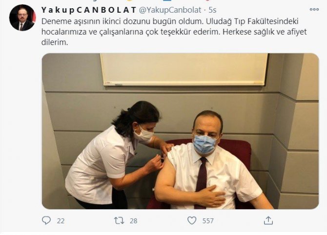 Aşının ikinci dozunu da yaptırdığını sosyal medya hesabından duyuran Vali Yakup Canbolat, "Deneme aşısının ikinci dozunu bugün oldum. Uludağ Tıp Fakültesindeki hocalarımıza ve çalışanlarına çok teşekkür ederim. Herkese sağlık ve afiyet dilerim." ifadelerini kullandı.