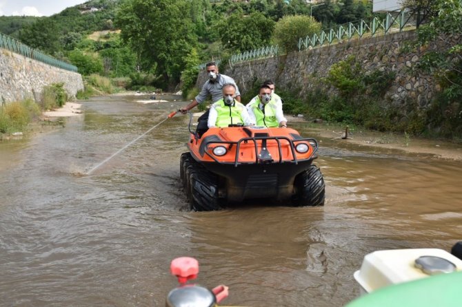 Daha sonra özellikle sulak alanların ilaçlanmasına kullanılan amfibik araca binen Başkan Aktaş, tören alanında yanından geçen Mandıras Deresi'ne inerek, dere içi ilaçlama çalışmalarına da bizzat katıldı.
