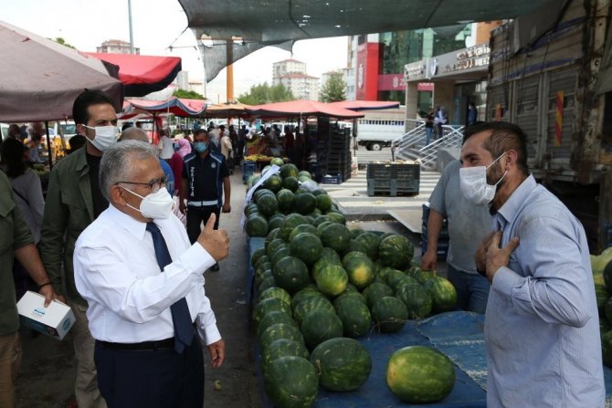 Başkan Büyükkılıç, Melikgazi ilçesinde bulunan Belsin Pazar Yeri'nde esnafları ziyaret ederek, pazardaki pandemi tedbirlerini yerinde denetledi ve kuralları hatırlattı. Öncelikle çevre esnafını gezen ve bereketli işler dileyen Başkan Büyükkılıç, esnaflara talep ve istekleri olup olmadığını sordu. Daha sonra Belsin Semt Pazarı'na geçen Büyükkılıç'ın, yetkililer tarafından ateş ölçer ile ateşi ölçüldü.