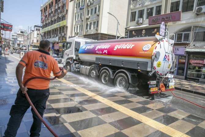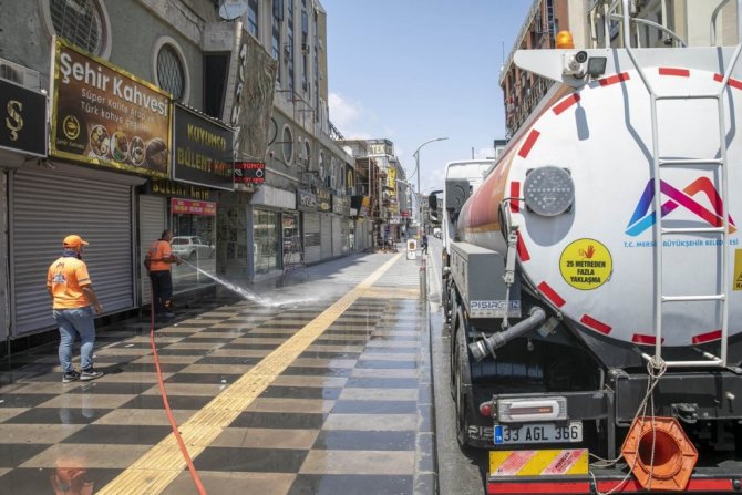 Çevre Koruma ve Kontrol Dairesinin Temizlik Şefi Danyal Güngör, merkez Akdeniz ilçesi Silifke Caddesinde yürütülen yol yıkama çalışmaları ile kent genelinde sürdürülen çalışmaları anlattı. Yasakların uygulandığı hafta sonu işlek caddelerde çalışmaları yoğunlaştıklarını belirten Güngör, "Özellikle Akdeniz ilçesinde çarşı merkezinde, İstiklal Caddesi, Silifke Caddesi ve Atatürk Caddesi gibi yerlerde hafta içi çok yoğun insan sirkülasyonu oluyor. Hafta içi özellikle insanların daha az olduğu yerlere yoğunlaşıyoruz. Hafta sonu ise tam aksine hafta içi yoğun olup da hafta sonu sakinleşen bölgelere yoğunlaşıyoruz. Kaldırımlarımızın tamamını basınçlı su yardımıyla yıkıyoruz. Yollarımıza dökülen katı maddeleri de vakumlu yol süpürme araçlarıyla temizliyoruz. Tertemiz bir hale getiriyoruz" diye konuştu.