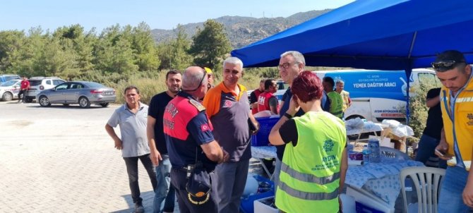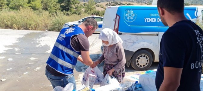 Yoğun duman ve sıcaktan etkilenen görevli ve gönüllülerin ihtiyaçlarını karşılamak için tedarik zinciri oluşturan Aydın Büyükşehir Belediyesi, AYBA görevlileri ile vatandaşların ihtiyaçlarını karşılıyor.