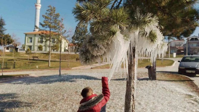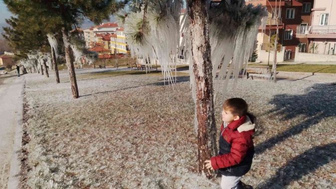 İlçede bir haftadır hava sıcaklığı sürekli olarak sıfırın altında seyrederken, dün gece hava sıcaklığı sıfırın altında eksi 12 dereceye kadar düştü. Dağçeşme Mahallesi'ndeki çam ağaçları ve bankların buz tutması kartpostallık güzellikler oluşturdu.